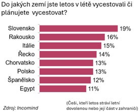 U Čechů, kteří navštíví letos v létě zahraničí, je nejoblíbenější destinací Slovensko, kam zavítá 19 % z nich (častěji lidé nad 50 let a obyvatelé Moravy). Geografická blízkost hraje roli i u druhé země v pořadí, Rakouska (18%), do kterého míří zejména lidé s vysokoškolským vzděláním a obyvatelé jihozápadní části Čech. Až po nich následují přímořské státy – Itálie (15 %, zejména lidé do 35 let) a Řecko (14 %) s Chorvatskem (13 %), které nejvíce lákají rodiny. Následují Polsko (13 %, častá destinace především pro obyvatele Moravskoslezského kraje) a Španělsko (12 %, s vysokým zastoupením padesátníků a šedesátníků).